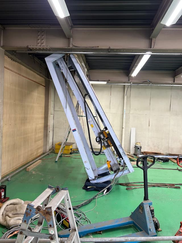 まず私たちは事前に現場の構造を入念に確認し、天井の梁の強度や位置を計算した上で作業計画を立案しました。重量物搬出では搬出ルートの確認(建物入口、通路幅、床の強度、段差、天井高など)や対象機械の重量・寸法の把握、必要機材の選定が初手の重要なフローとなります[4]。今回は天井梁が使えると判断したため、まず機械上部をその梁に専用の鉄製チェーンと吊り具(チェーンブロック等)でしっかり固定しました[5]。上部を梁から吊り支えた状態で、下部からはウインチ式の引き寄せ工具を用いて角度を少しずつ調整していきます。もちろん一度に大きく倒そうとするのは非常に危険なため、ここでは「引く → 下ろす → 固定 → 確認」という工程を何度も反復し、徐々に角度を変えながら慎重に傾けていく方法を採りました。実際、類似案件ではチェーンブロックで吊り上げた機械をゆっくり降ろしつつ台車で支える作業を繰り返し、水平に寝かせるまでに3時間以上要した例もあります[6]。時間をかけてでも細心の注意を払うことで、機械本体や建物を傷つけることなく安全にパネルソーを水平状態へ移行させ、無事に床へ設置することができました。なお、今回のように天井に梁がありチェーン固定が可能な場合は梁を利用しましたが、もし現場に鉄骨梁がない場合でもご安心ください。 当社では移動式の門型クレーンなど専門機材を用意しておりますので、そのような環境でも重量物を安全に吊り上げ・搬出することが可能です[7]。現場ごとの条件に合わせて最適な方法と機材を選定し、「安全第一」で作業を進めてまいります。
